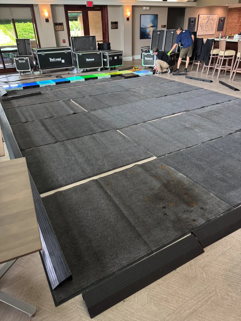 If your venue has carpet, we can install the floor over carpet up to ½ inch thick using a plastic mat underlayment. This helps keep the surface even and minimizes shifting, which is especially important for larger dance floors.