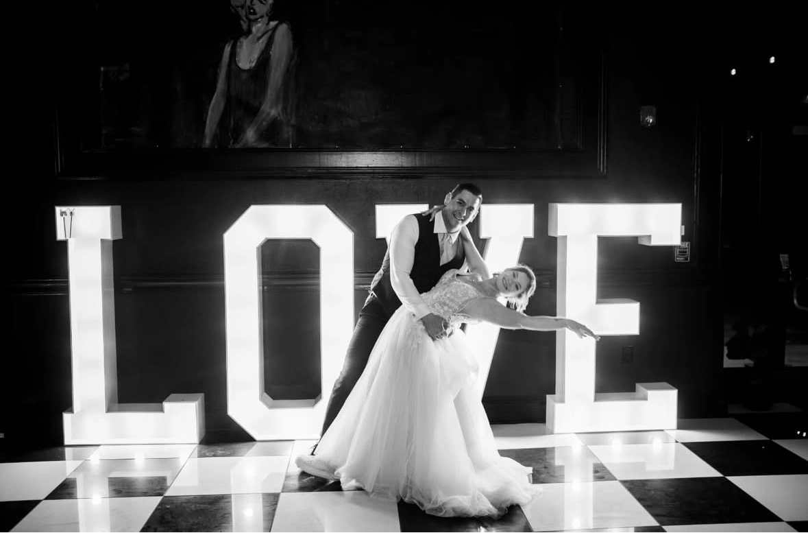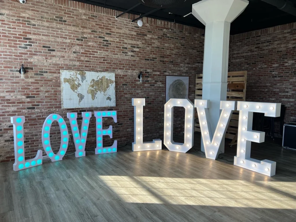 Our LOVE letters are available in different sizes and lighting styles, making them a strong option when room lighting is too bright for digital monograms or when couples want something guests can physically interact with.