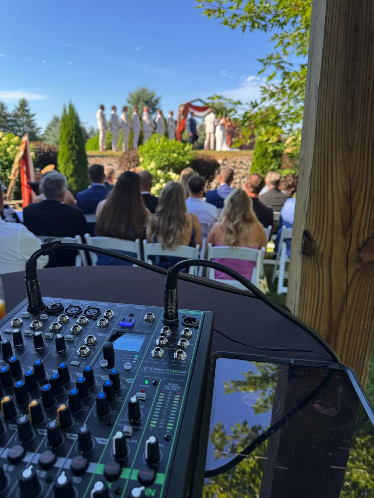 We strategically place speakers so the sound carries naturally, not loudly. You’ll have music for your entrance and exit, plus a microphone for the officiant, all tested and ready well before guests arrive. And if your ceremony is outdoors or in a location without power, we’ve got battery-powered options that look clean and work reliably.